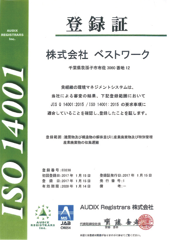 私たちベスト・ワークは、年々厳しくなる解体事業に関する法令に対応し、常にその遵法を心掛けています。お施主様が、次に活用される土地を明確にイメージし、これから実施される建築等が順調に進むよう、近隣の皆様との関係を維持することを意識しながら作業を行っていきます。現場管理等と意思決定機関を介さない、独立した安全管理専門の職を配し、工事が安全に行われているかベスト・ワーク独自の「現場巡回チェック39項目」を設定し確認を行っております。